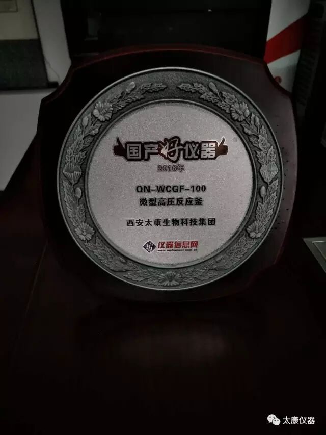 太康QN-WCGF-100微型高压反应釜,经受住层层考验,得到用户及专家的一致好评,双双入选由中国仪器仪表行业协会指导,仪器信息网主办的“国产好仪器”,成为反应釜行业第一个入选“国产好仪器”的企业。颁奖仪式上,中国仪器仪表协会杨秘书长向西安太康仪器科技有限公司总经理程维强先生亲自授牌并合影留念。